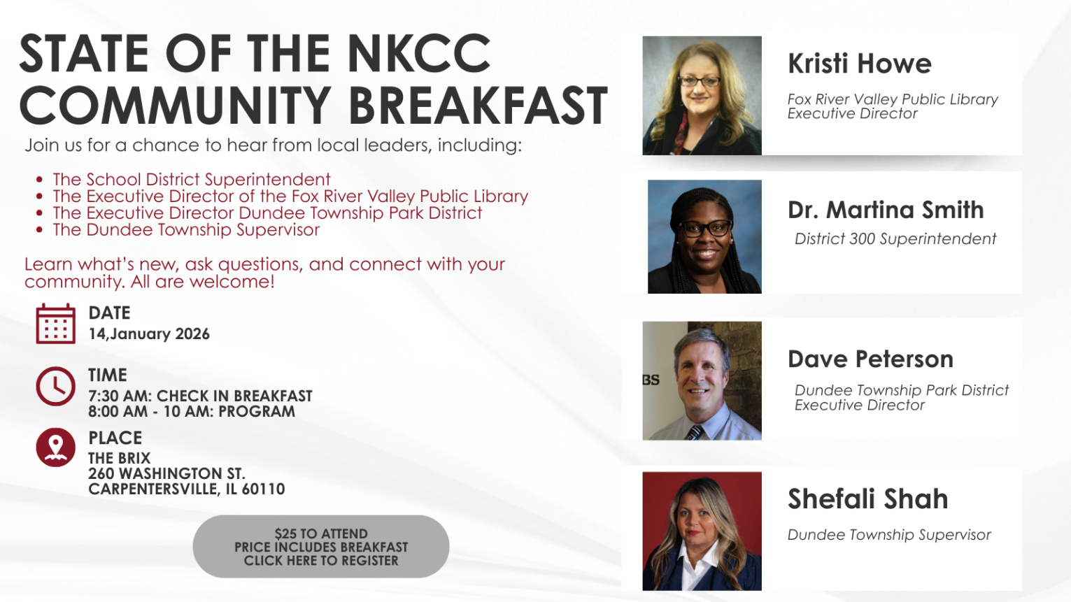 Join Us for a Community Leaders Forum! We invite you to be part of an informative and engaging event featuring several of our area’s top leaders. This is a wonderful opportunity to hear firsthand updates, learn about upcoming initiatives, and better understand the work being done throughout our community. Our guest speakers include: The School District Superintendent The Executive Director of the Fox River Valley Public Library The Executive Director of the Dundee Township Park District The Dundee Township Supervisor During this event, you’ll gain valuable insight into current projects, future plans, and ways these organizations are supporting residents. Attendees will also have the chance to participate in a Q&A session, ask questions directly, and share thoughts on issues that matter most. Whether you’re a resident, business owner, parent, or simply someone who cares about the future of our community, this is a can’t-miss opportunity to get informed and get involved. Connect. Learn. Engage. All are welcome!